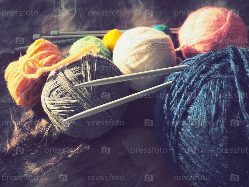 Вяжем шарф или свитер из серой, синей, белой и оранжевой пряжи. Мотки шерстяных и акриловых ниток. Вязание как хобби. Фурнитура, спицы, крючки