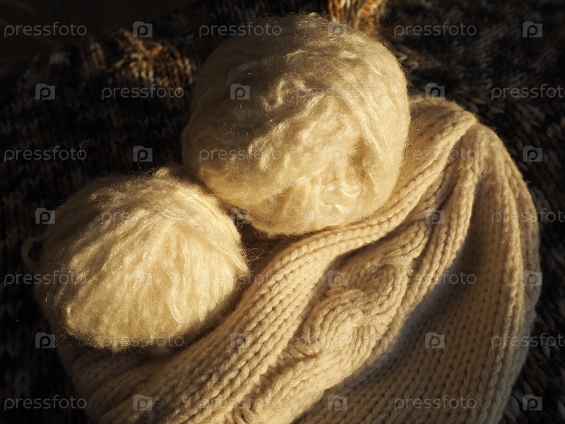 Клубки пряжи, вязаная одежда, спицы и крючки. Вязание как хобби. Коричневые, бежевые и белые нитки в мотках. Расфокусированное изображение