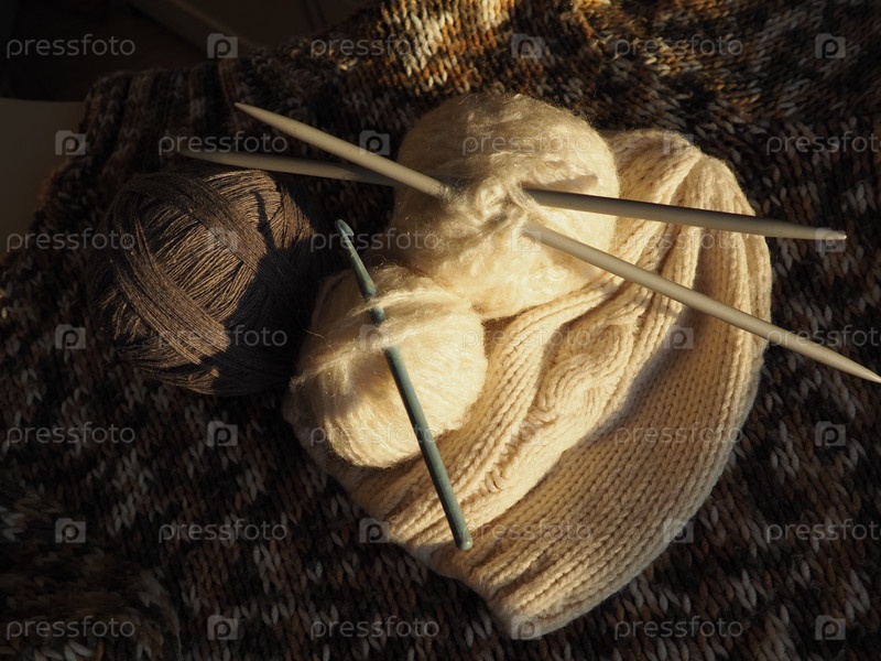 Клубки пряжи, вязаная одежда, спицы и крючки. Вязание как хобби. Коричневые, бежевые и белые нитки в мотках. Расфокусированное изображение