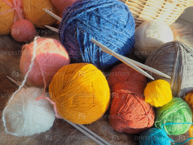 Вяжем шарф или свитер из серой, синей, белой и оранжевой пряжи. Мотки шерстяных и акриловых ниток. Вязание как хобби. Фурнитура, спицы, крючки