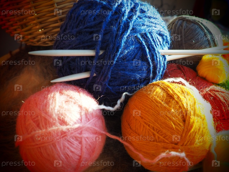 Вяжем шарф или свитер из серой, синей, белой и оранжевой пряжи. Мотки шерстяных и акриловых ниток. Вязание как хобби. Фурнитура, спицы, крючки