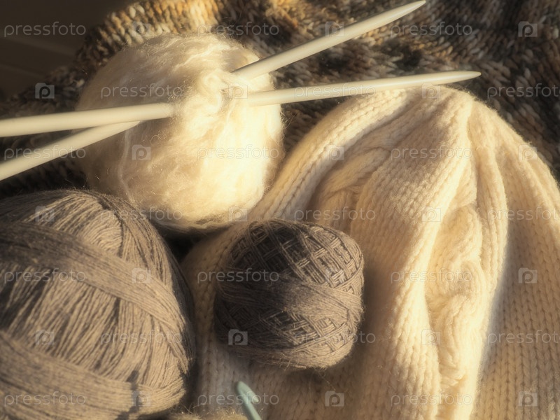 Клубки пряжи, вязаная одежда, спицы и крючки. Вязание как хобби. Коричневые, бежевые и белые нитки в мотках. Расфокусированное изображение