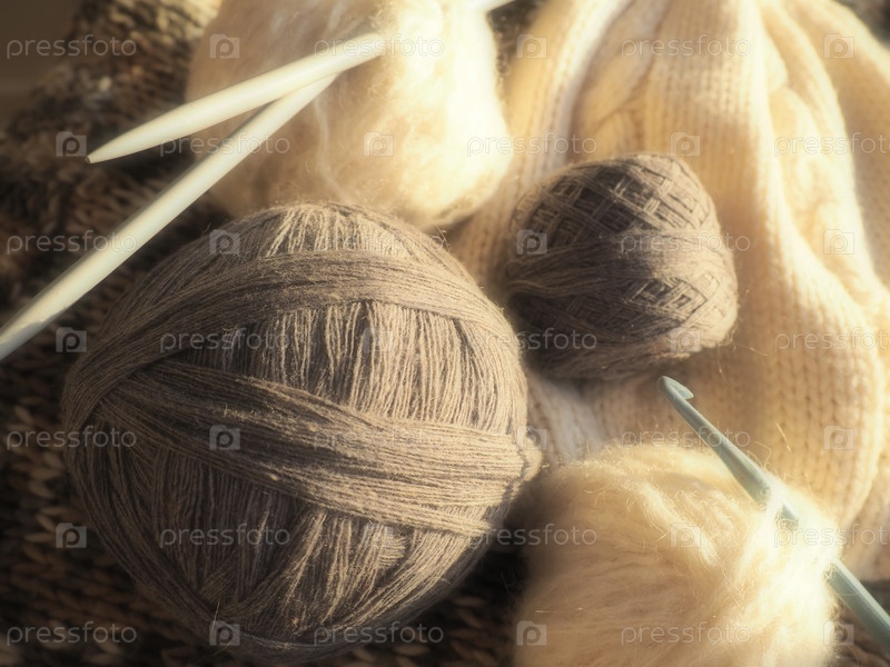 Клубки пряжи, вязаная одежда, спицы и крючки. Вязание как хобби. Коричневые, бежевые и белые нитки в мотках. Расфокусированное изображение