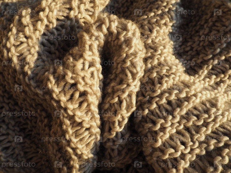 Вязаное изделие из объемной полиакриловой пряжи бежевого или коричневого цвета. Пышная коробка машины. Вариант теплого гардероба на осенне-зимний период. Теплый шарф, свитер или джемпер
