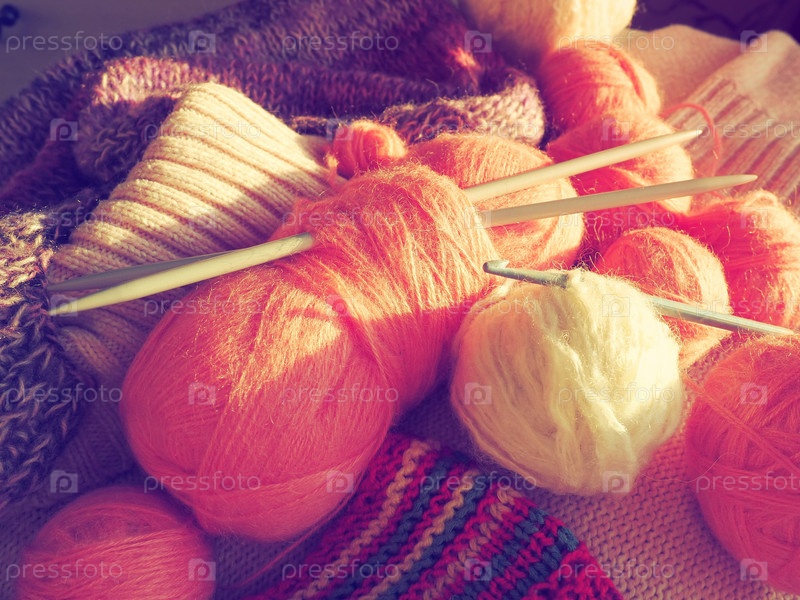 Запутывается, рычит. Клубки пряжи и ниток, вязаная одежда, спицы и крючки. Розовые, фиолетовые, красные и белые нитки в мотках. Расфокусированное изображение. Вязание и плетение как хобби