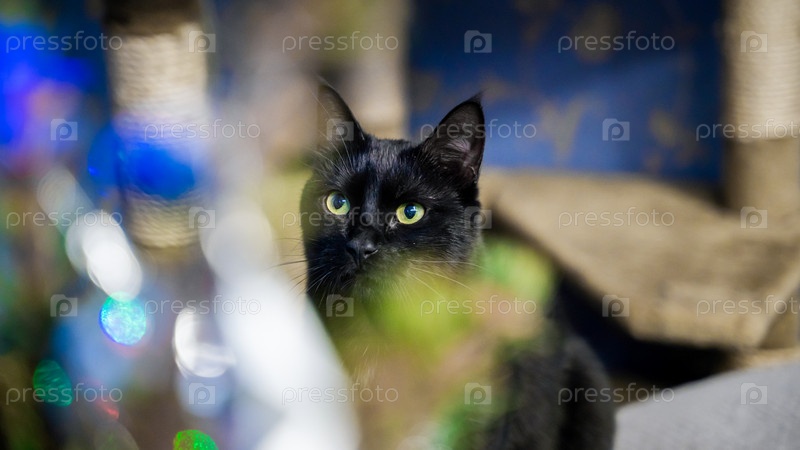 Черный кот с удивлением смотрит на елку с праздничными огнями