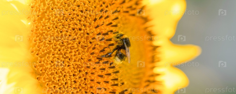 Милый мохнатый шмель сидит на подсолнухе в ясный солнечный день, позитивный образ