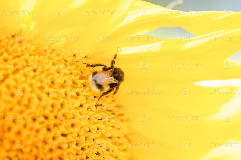 Милый лохматый шмель сидит на подсолнухе и дает тебе пять лапой, позитивный образ