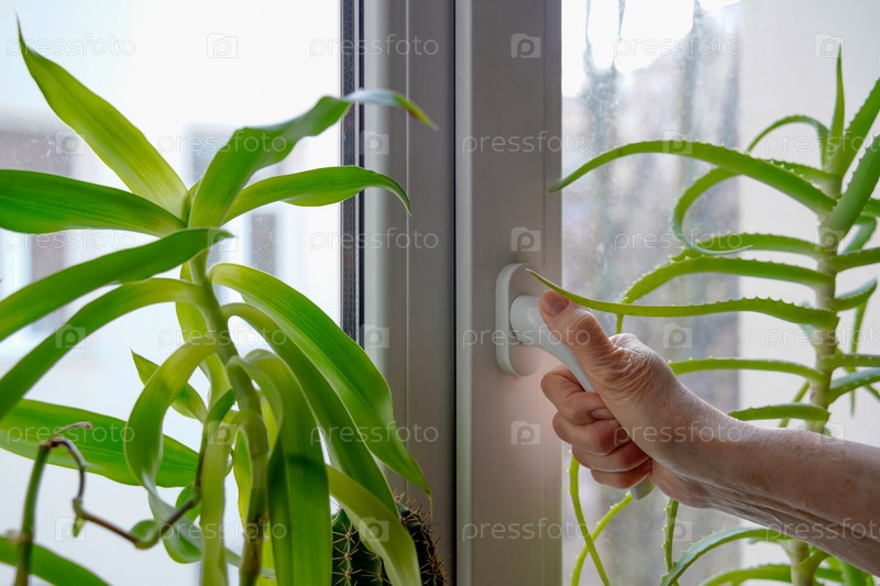 Окно с зелеными комнатными растениями