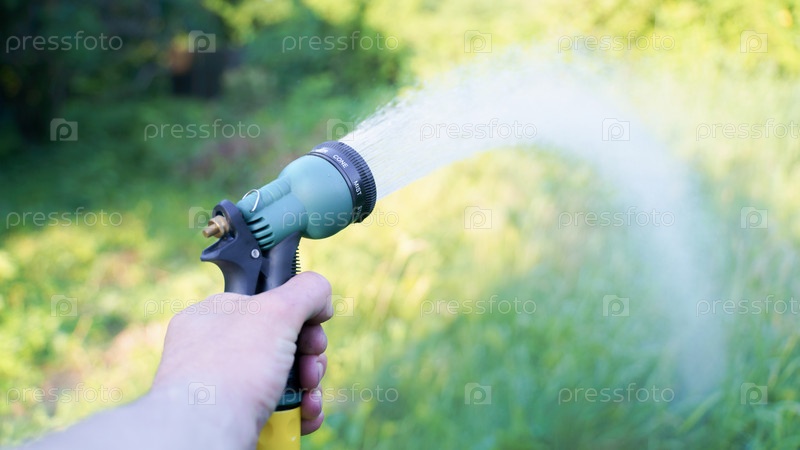 Садовник поливает сад из насадки из шланга