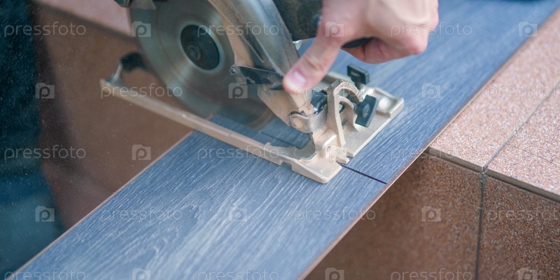 Плотник режет деревянную панель электроинструментом