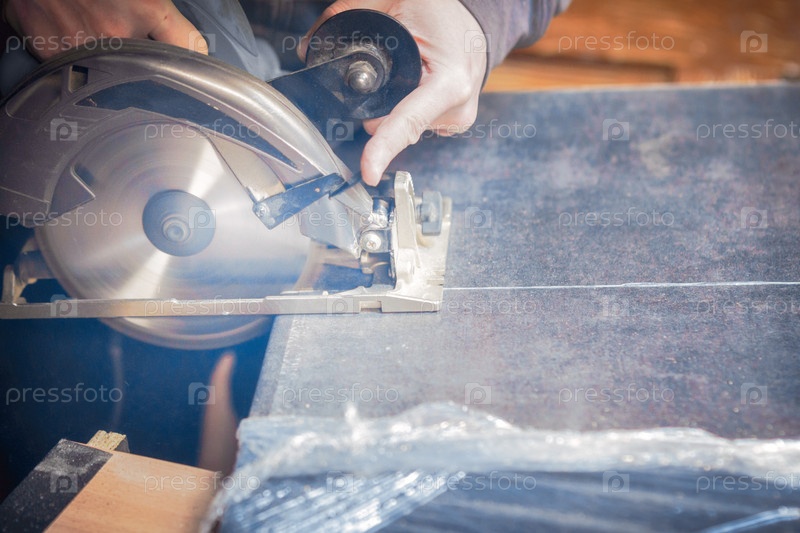 Плотник режет деревянную панель электроинструментом