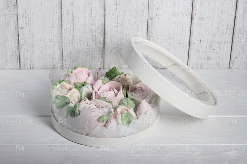 Зефирные цветы. Зефир в коробке. Домашний зефир. Белая шляпная коробка. Коробка с прозрачными стенками и крышкой