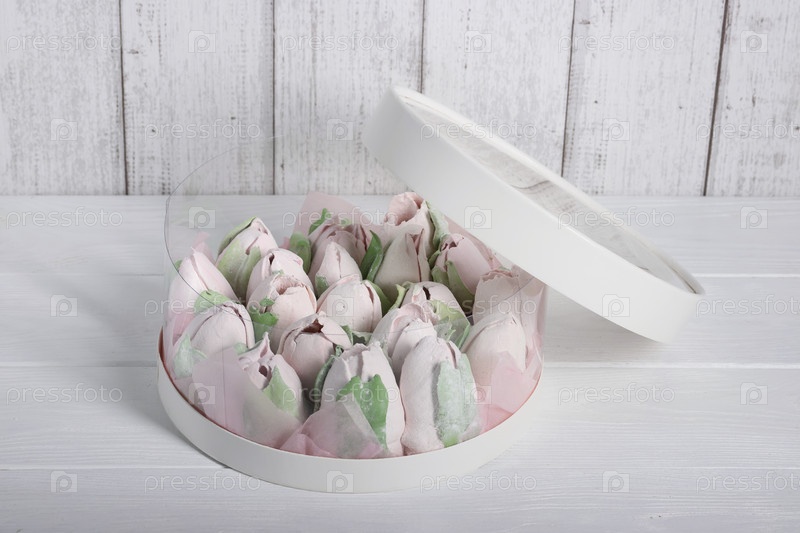 Зефирные цветы. Зефир в коробке. Домашний зефир. Белая шляпная коробка. Коробка с прозрачными стенками и крышкой