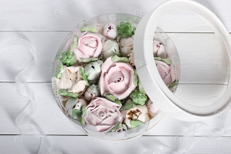 Зефирные цветы. Зефир в коробке. Домашний зефир. Белая шляпная коробка. Вид сверху