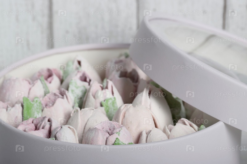 Зефир в шляпных коробках. Зефирные цветы. Домашний зефир. Белая шляпная коробка. Коробка открыта. Крупный план