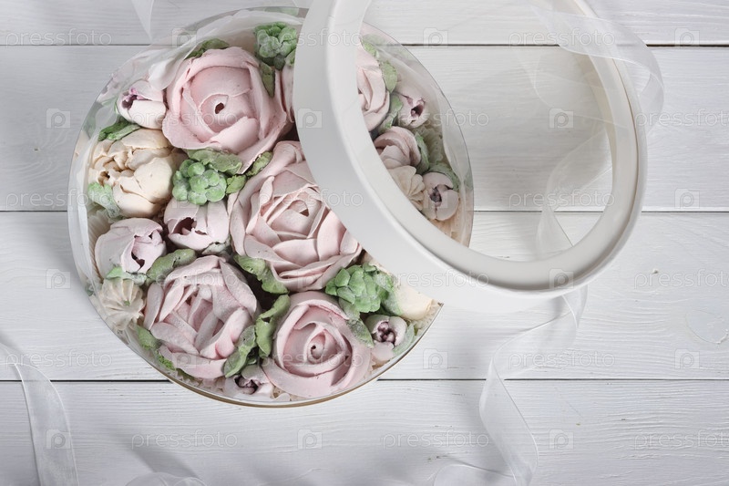 Зефир в шляпных коробках. Зефирные цветы. Домашний зефир. Белая шляпная коробка. Коробка открыта. Вид сверху