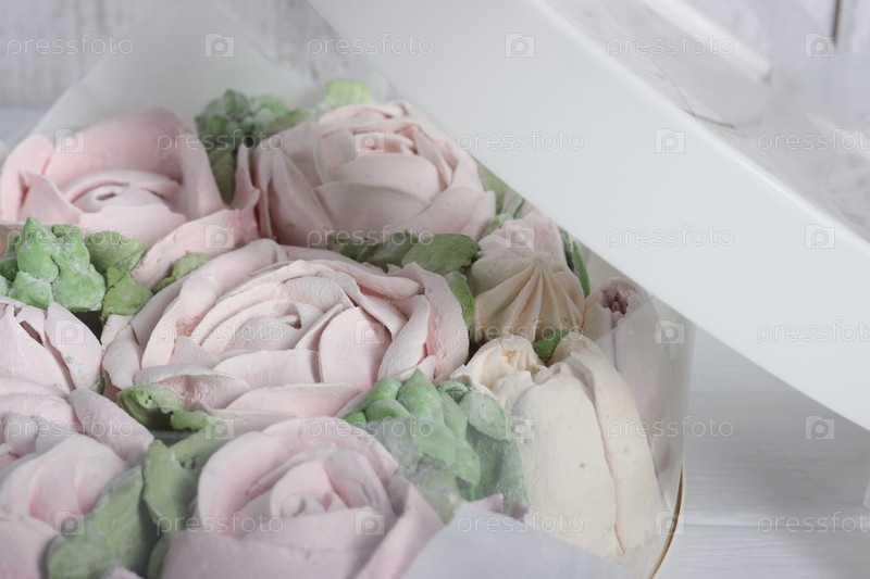 Зефир в шляпных коробках. Зефирные цветы. Домашний зефир. Белая шляпная коробка. Коробка открыта. Крупный план