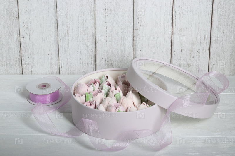 Зефир в шляпных коробках. Зефирные цветы. Домашний зефир. Белая шляпная коробка. Рядом лежит упаковочная лента