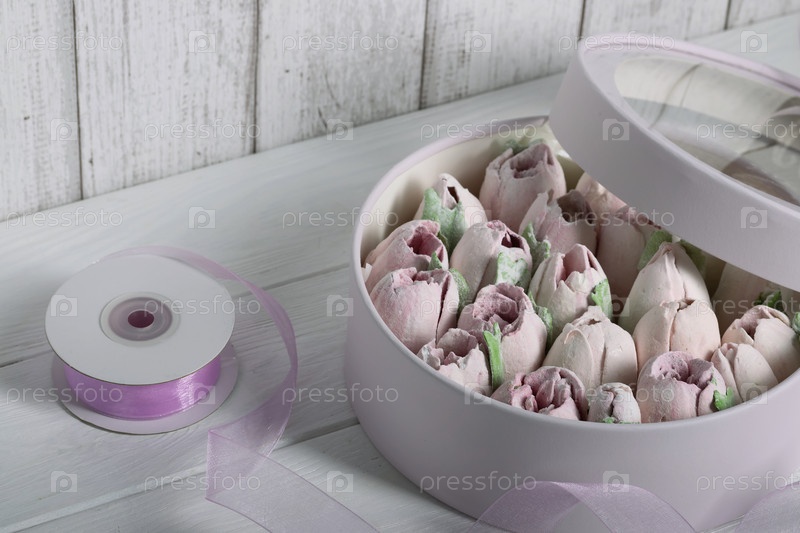 Зефир в шляпных коробках. Зефирные цветы. Домашний зефир. Белая шляпная коробка. Рядом лежит упаковочная лента