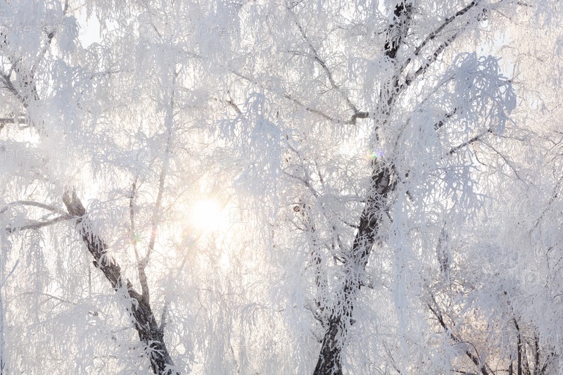 Зимний красочный пейзаж. Березовый морозный лес под ярким солнцем