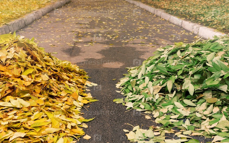 Осенние желтые и зеленые листья в двух кучках