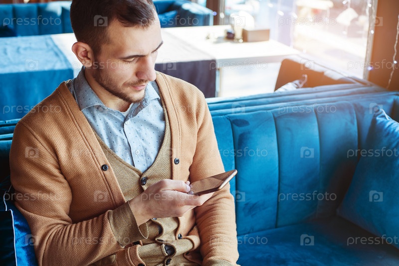 Современный молодой человек сидит в кафе и держит в руках мобильный телефон