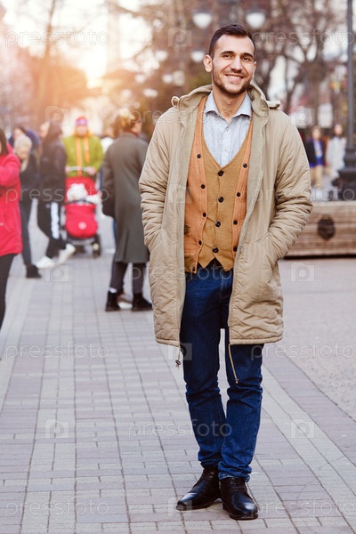 Молодой смуглый мужчина ходит по улицам города