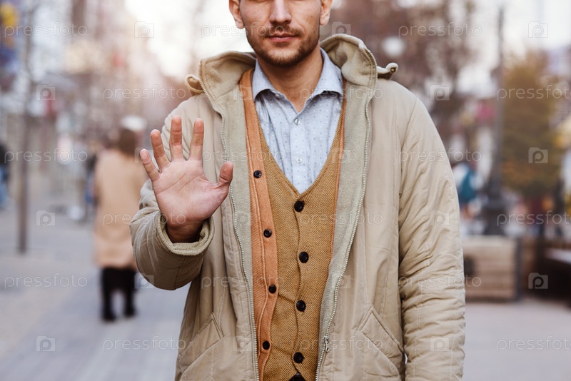 Молодой смуглый и стильный мужчина на улице показывает свою ладонь