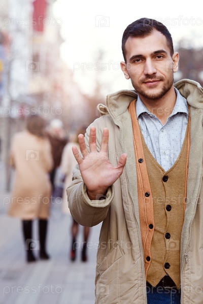Молодой смуглый и стильный мужчина на улице показывает свою ладонь