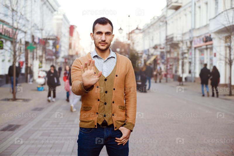 Молодой смуглый и стильный мужчина на улице показывает свою ладонь