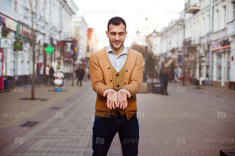 Молодой человек стоит посреди улицы и показывает ладони. Понятие подарка и дарения