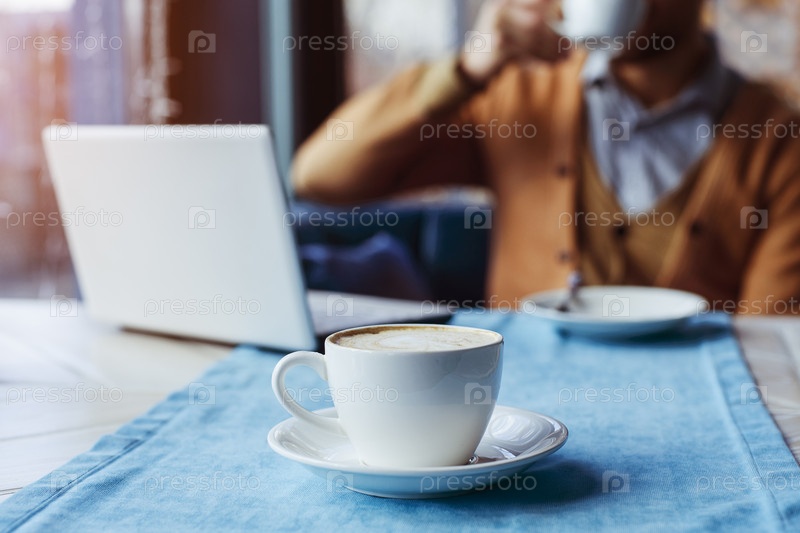 Мужчина сидит за столом и пьет кофе. Чашка кофе на переднем плане. Фон размыт. Крупный план