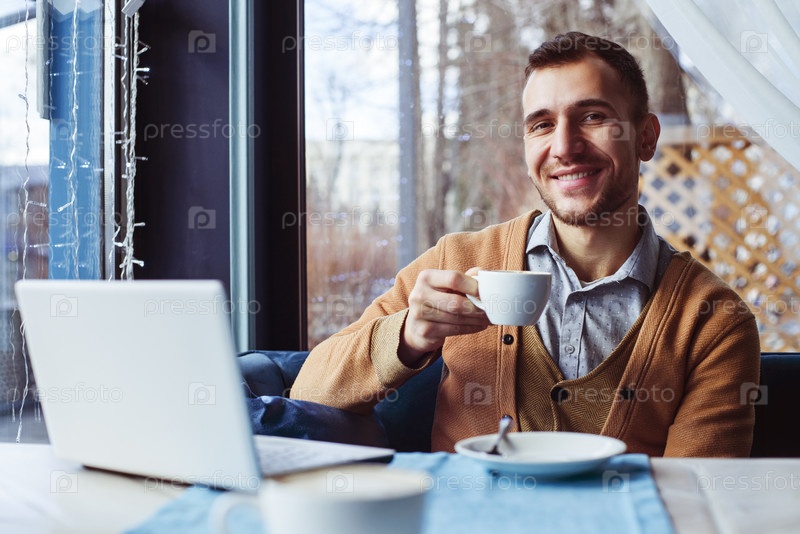 Мужчина сидит за столиком в кафе, держит чашку кофе и улыбается. Рядом на столе стоит белый ноутбук