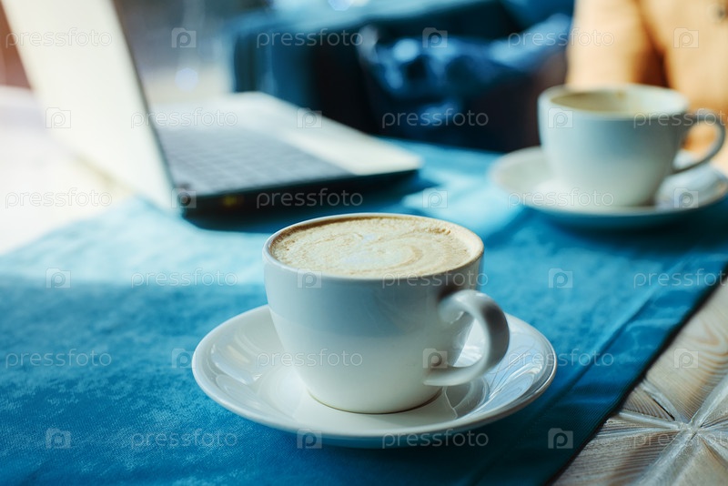 Две чашки кофе на столе в кафе. Одна чашка на переднем плане. На заднем плане белый ноутбук. Крупный план