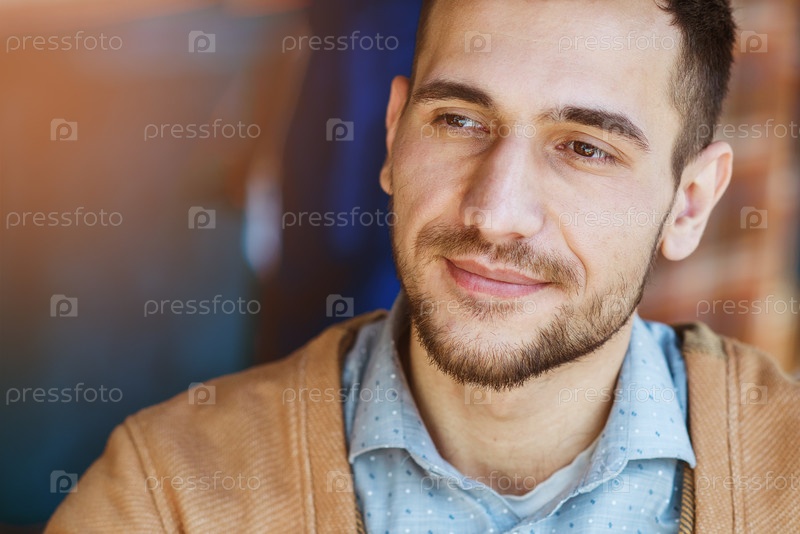 Портрет успешного человека, который находится в кафе. Мужчина улыбается. Портрет крупным планом