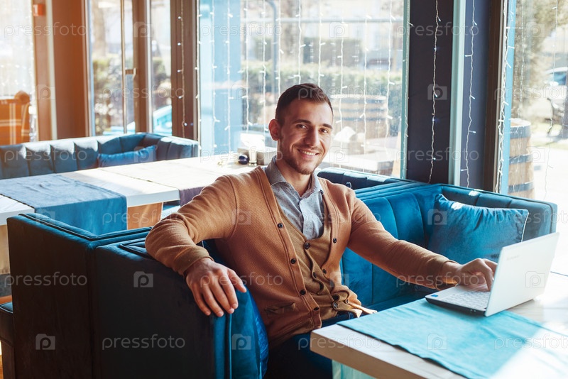 Молодой человек работает за ноутбуком в уютном кафе. Концепция бизнеса и коворкинга. Портрет мужчины