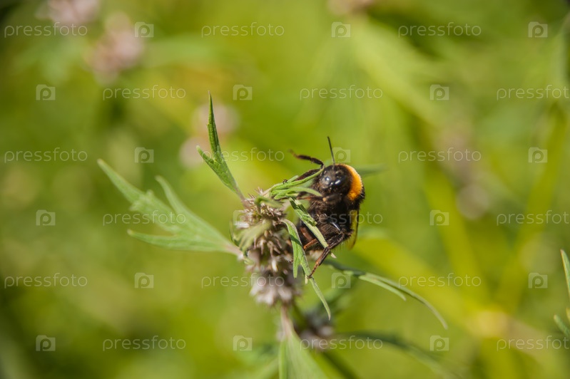 Черно-желтый полосатый горный шмель собирает пыльцу