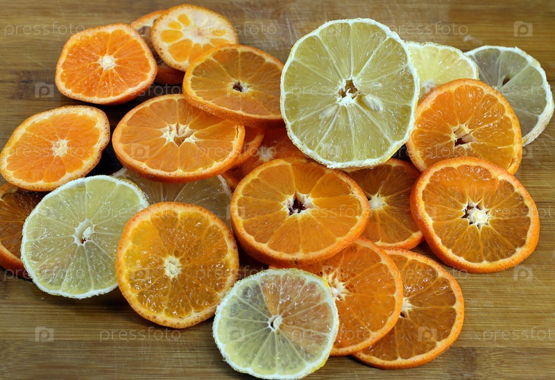 Нарезанные ломтики мандарина и лимона на разделочной доске