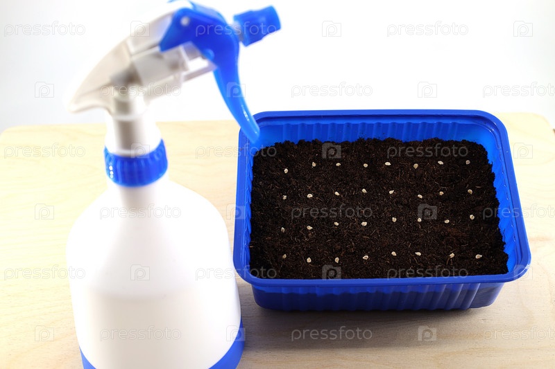 Семена томатов высевают в контейнер и опрыскиватель для полива