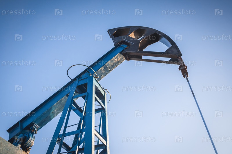 Масляный насос на фоне голубого неба и утреннего солнца, солнечные блики на масляном насосе