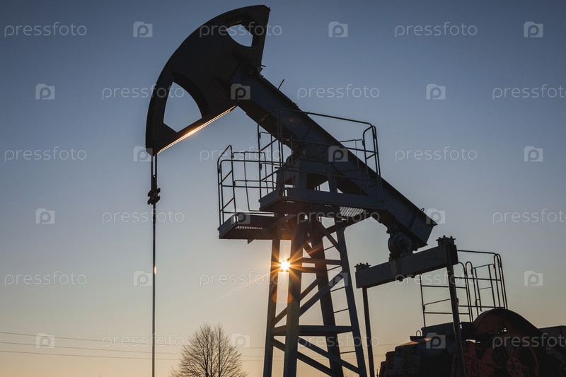 Масляный насос на фоне голубого неба и утреннего солнца, солнечные блики на масляном насосе