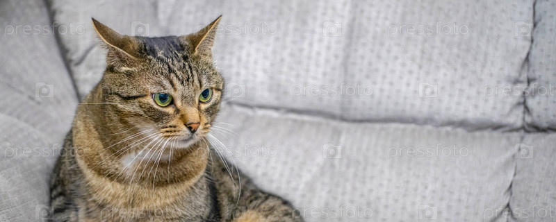Сонный полосатый кот сидит на диване