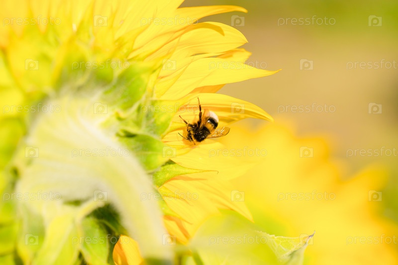 Милый мохнатый шмель сидит на подсолнухе в яркий солнечный летний день, позитивный образ