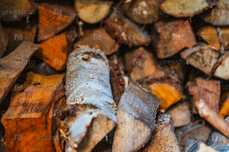 Дрова, сложенные в поленницу, размытый фон, текстура