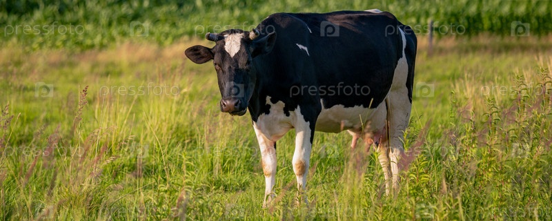 Коровы пасутся на сочном лугу в летний день