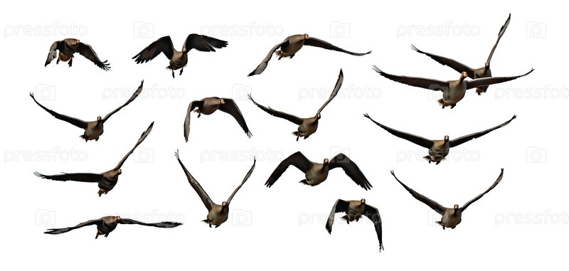 Отдельные изображения летающих диких гусей в разных позах на белом фоне. Конструктор птичьей стаи