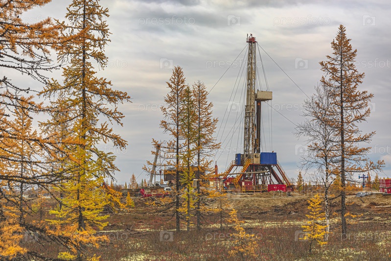 Пейзаж месторождения нефти и газа в северной лесотундре Сибири. Главный объект — буровая установка, которая вписывается в живописный осенний пейзаж таежных деревьев