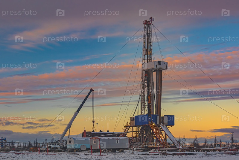 Гармоничное сочетание природы и техногенного ландшафта нефтегазового месторождения с буровой установкой и специальной техникой в полярной тундре
