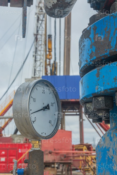 Арматура фонтана высокого давления в газовой скважине. На заднем плане размытое изображение буровой установки на северном газовом месторождении в Арктике